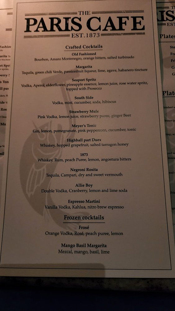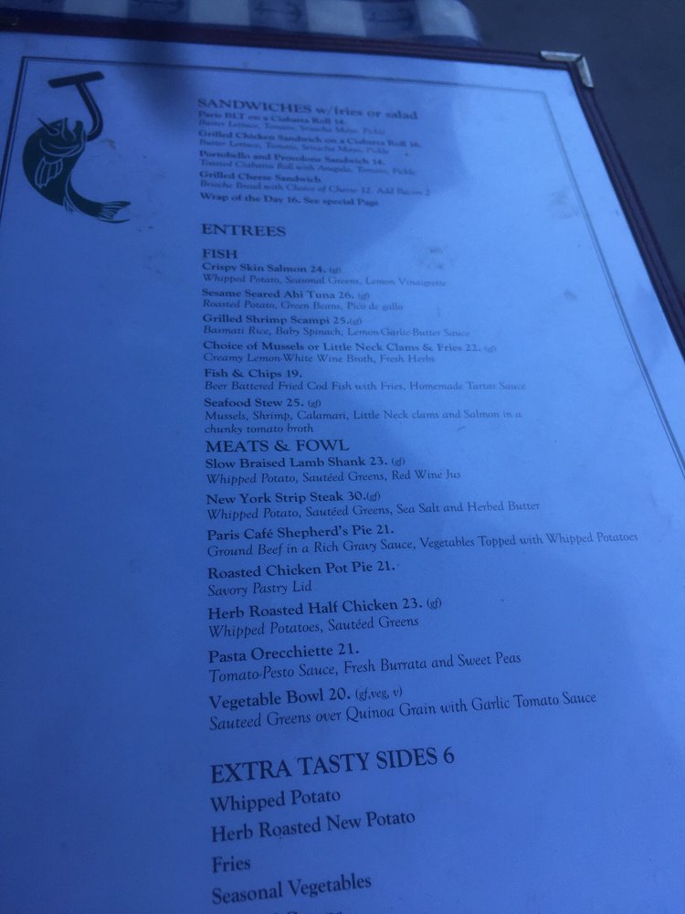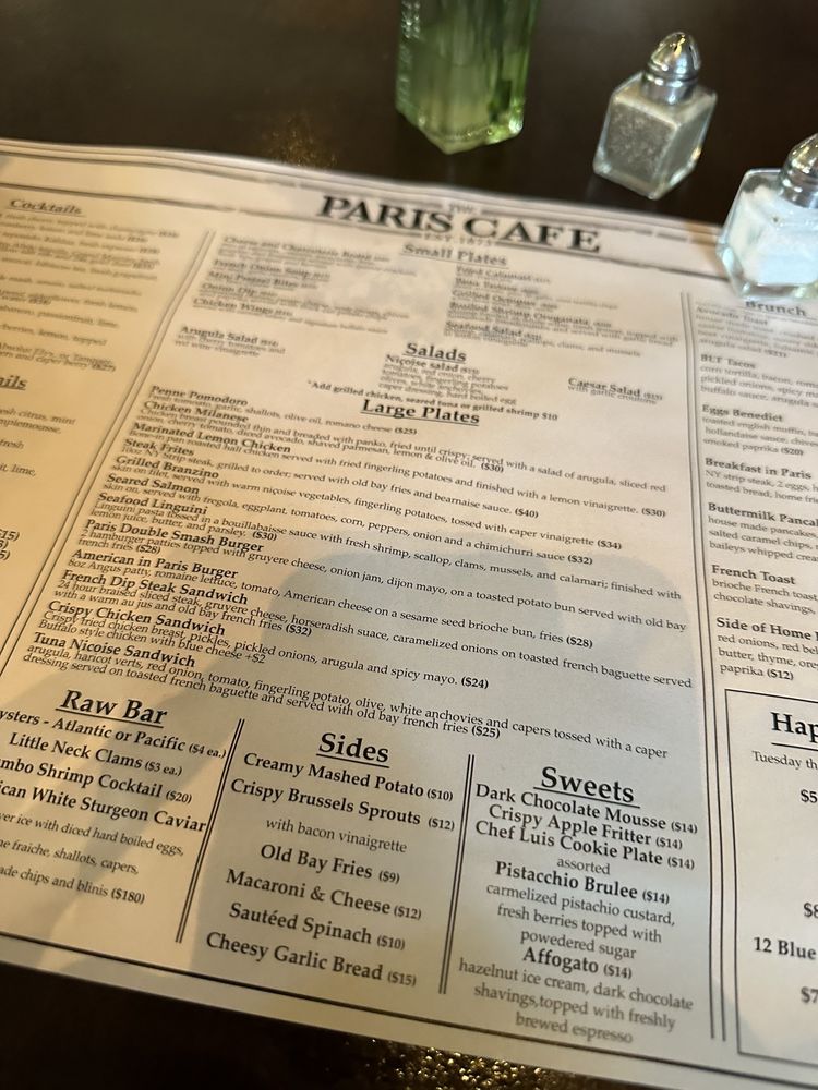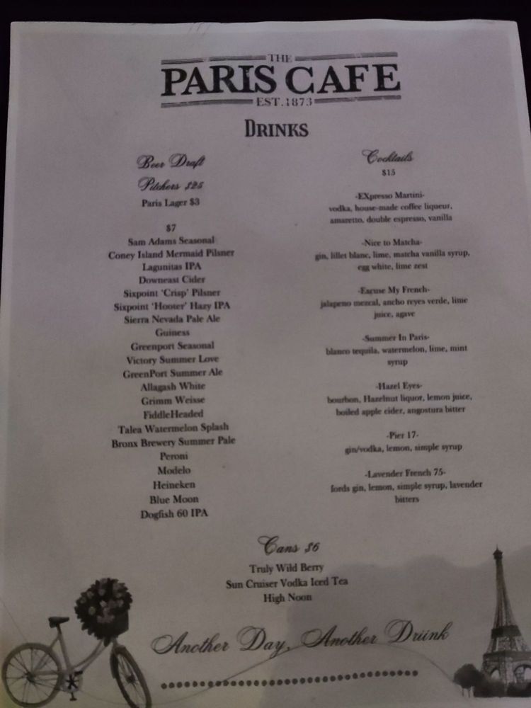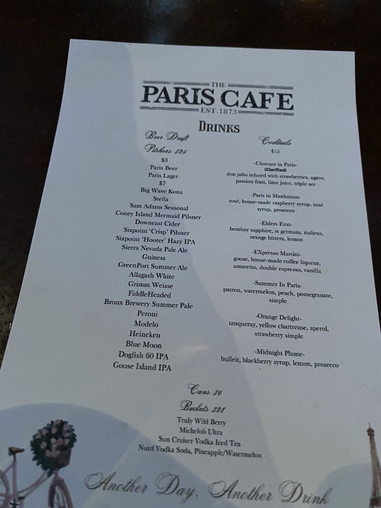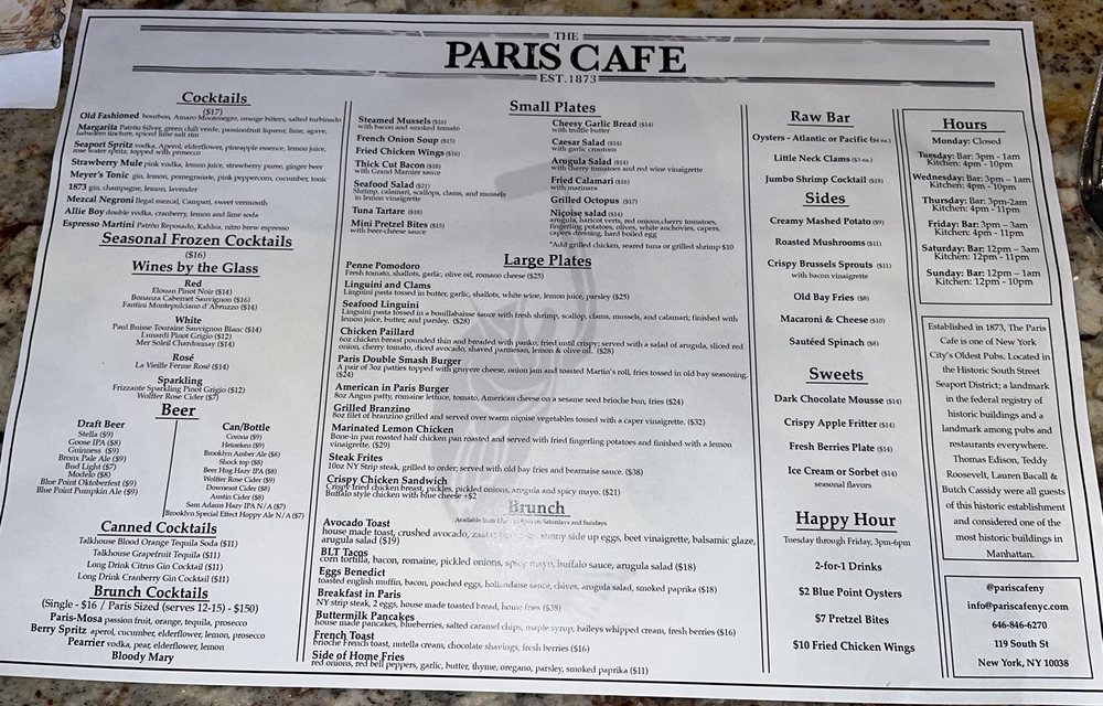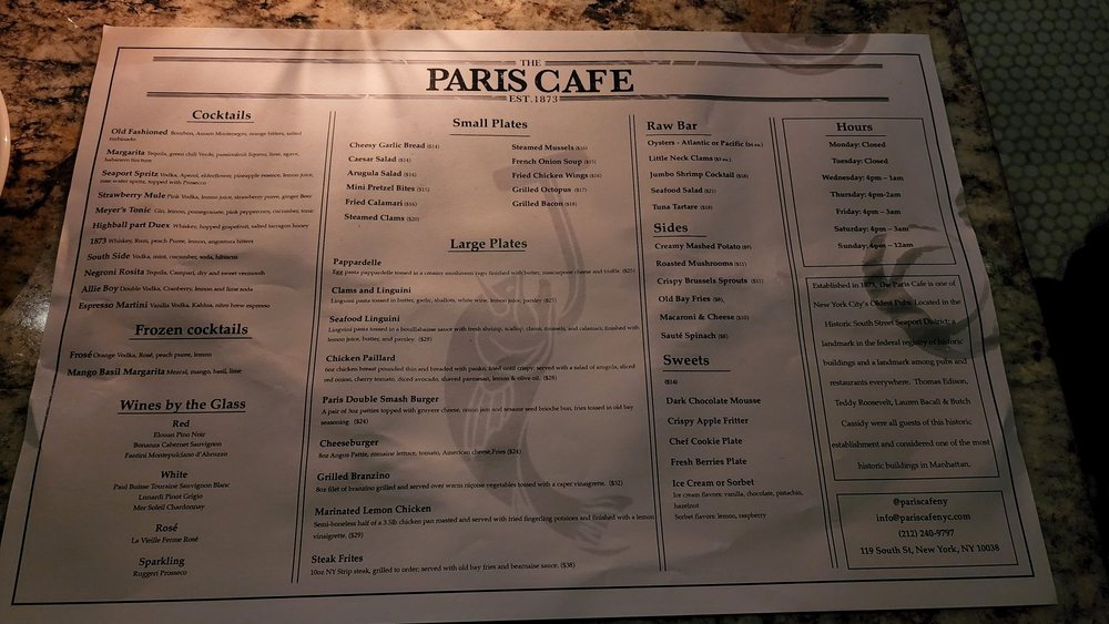 The Paris Cafe, located at 119 South St in New York, is a versatile establishment offering a wide range of amenities. This cocktail bar, breakfast & brunch spot, and cafe is perfect for any occasion. With options for vegan and limited vegetarian diets, as well as various payment methods including cryptocurrency, Apple Pay, and Android Pay, The Paris Cafe truly caters to everyone. Additionally, the cafe provides outdoor and heated seating, waiter service, and even allows dogs. The menu boasts a variety of dishes suitable for brunch, lunch, and dinner, with happy hour specials and a full bar available. With features like pool tables, TV, and Wi-Fi, The Paris Cafe is the ideal spot for a relaxing meal or social gathering.